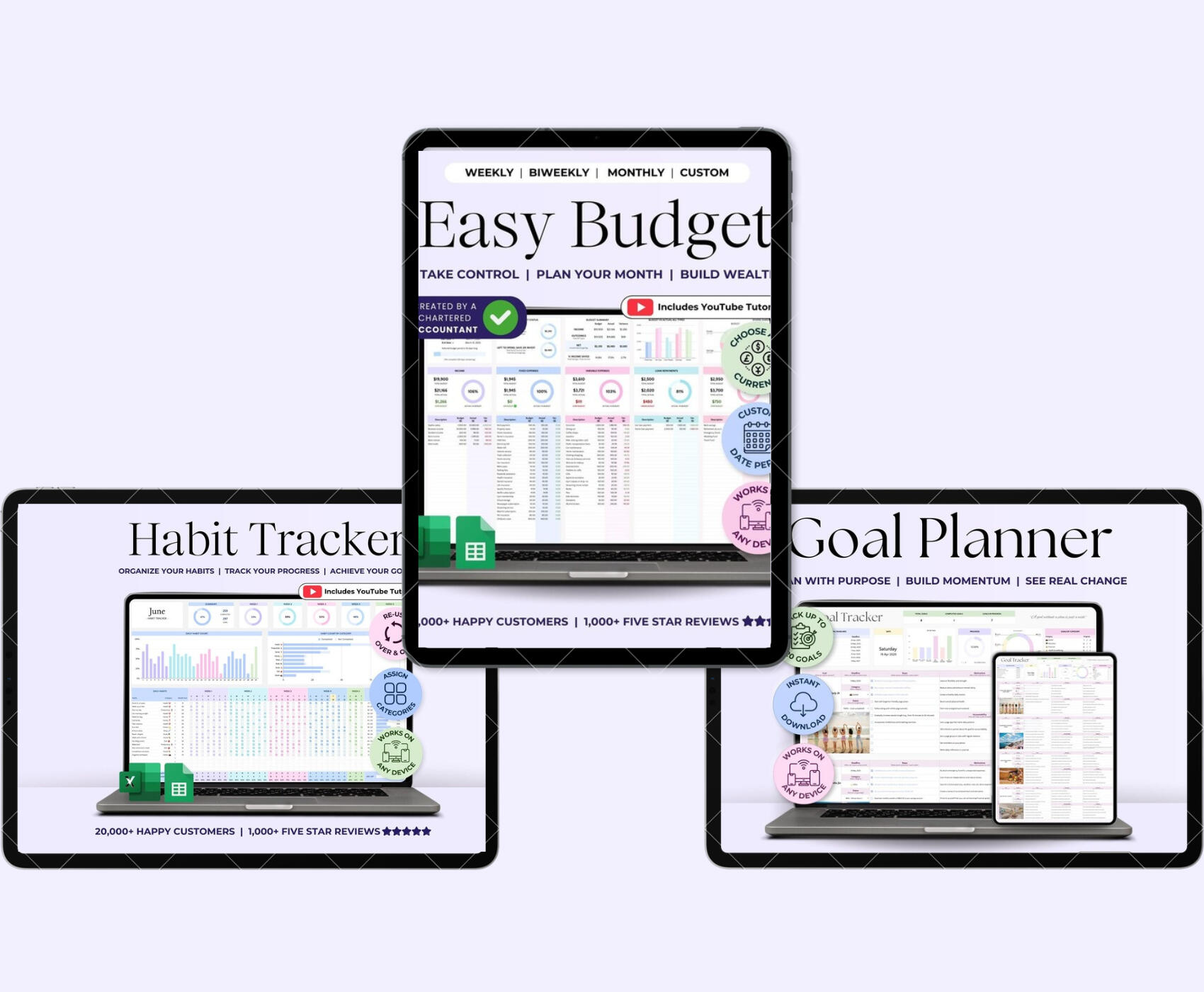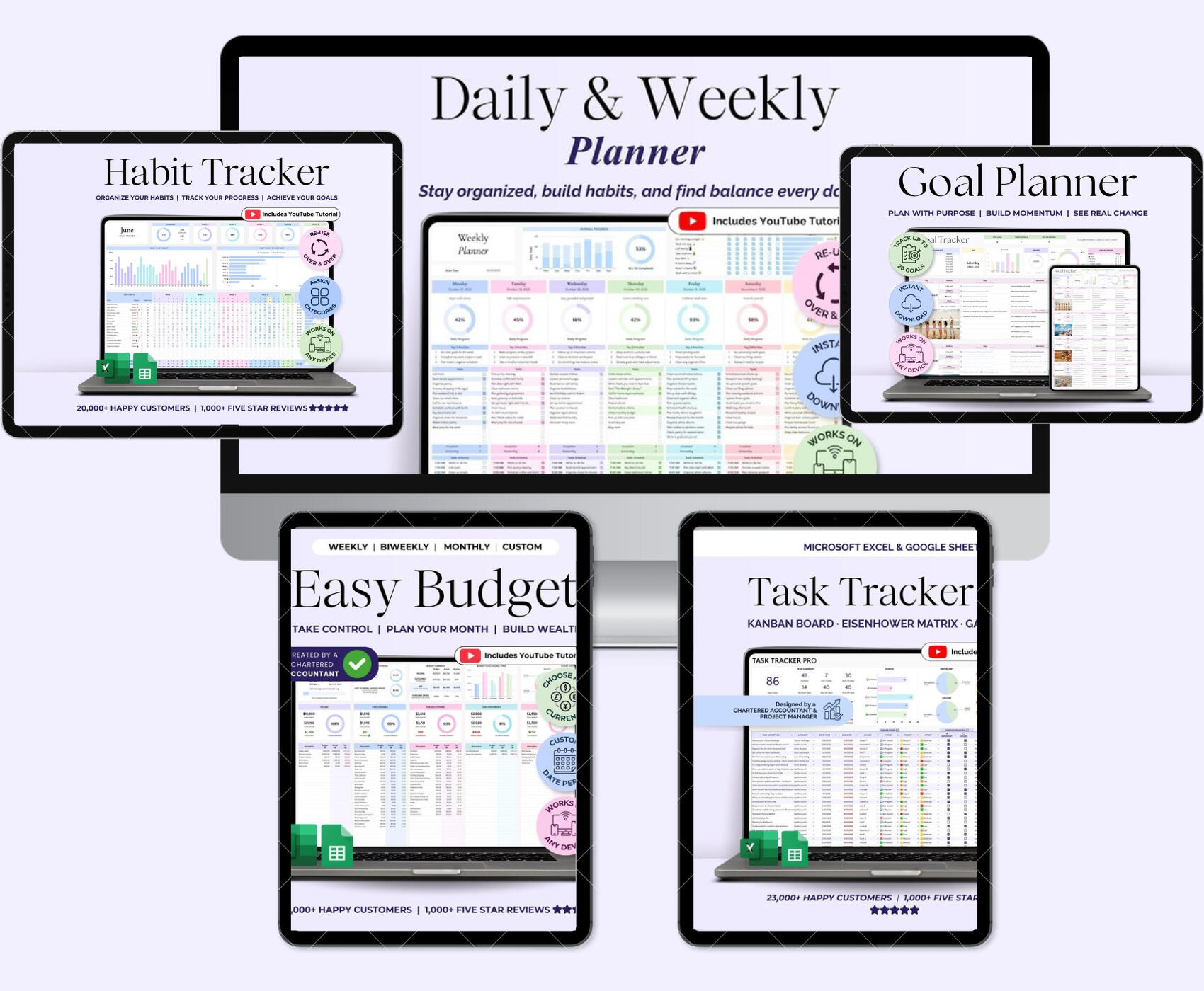 Everything you need to run your life like a pro. From daily habits to long-term goals, from project deadlines to monthly budgets - it's all here. Stop piecing together random apps and notebooks. Get the complete toolkit that covers every area of your productivity and personal growth. Five trackers for less than the price of three.